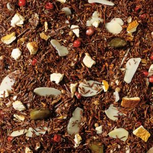 Rooibos, virutas de almendra, pistachos, piel de naranja, cilandro, pimienta rosa y aromas.