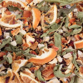 Triángulos de naranja, cáscara de naranja, y limón, kiwi, piña, zanahoria, mango, hierbaluisa, hibisco y aromas.